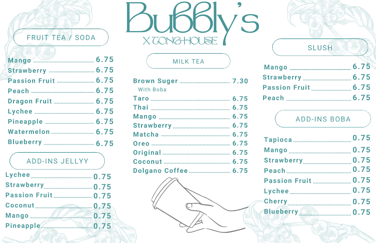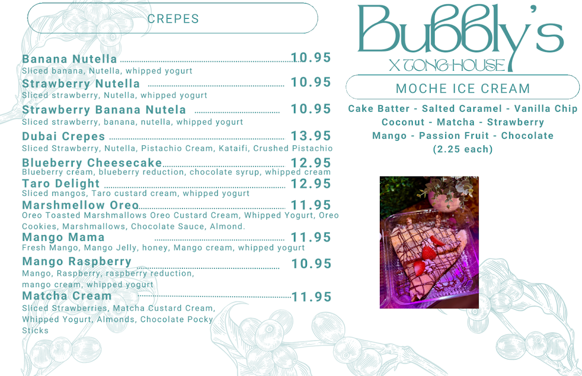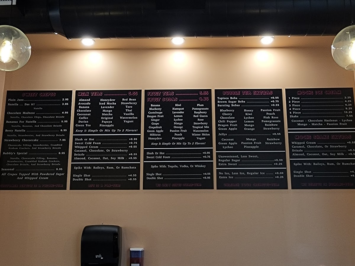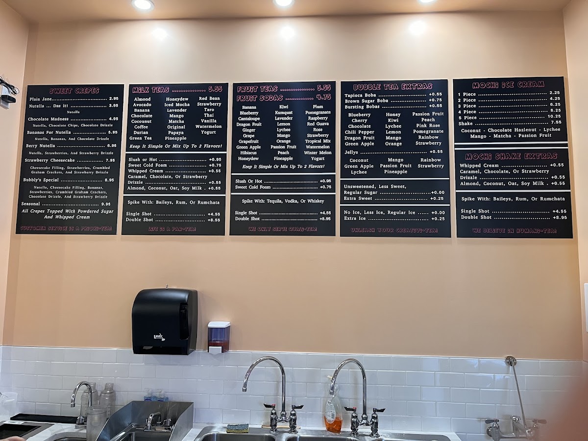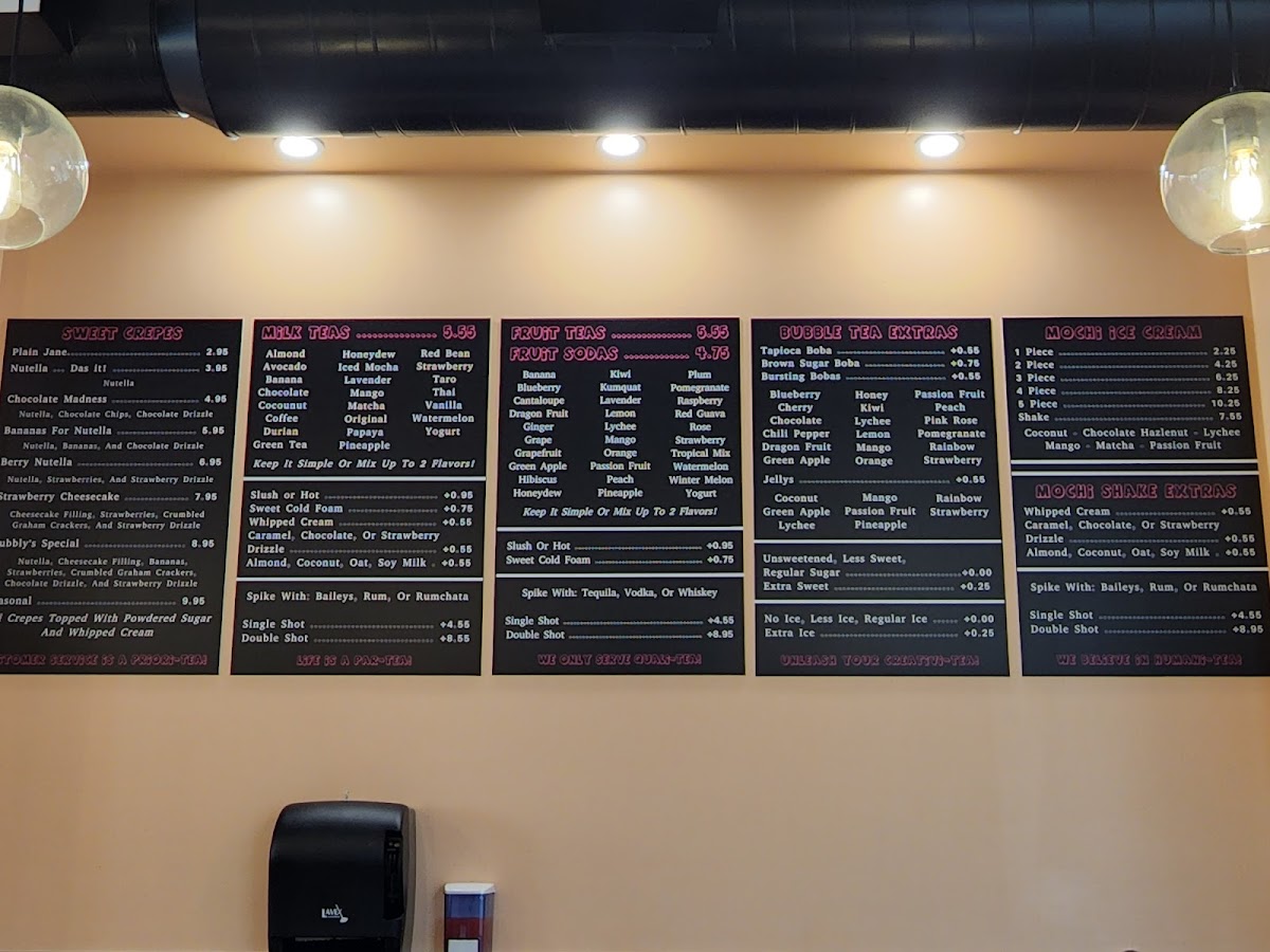 From a reviewer’s perspective, the menu at Bubbly’S Bubble Tea offers a pleasant variety of drinks and desserts that make it easy to find something refreshing or sweet. The Milk Tea selection includes favorites like Almond Milk Tea, Avocado Milk Tea, Brown Sugar Milk Tea, Coconut Milk Tea, and Honey Dew Milk Tea, while the Fruit Tea lineup features bright options such as Blueberry Fruit Tea, Cantaloupe Fruit Tea, Green Apple Fruit Tea, Kiwi Fruit Tea, and Lychee Fruit Tea. For something icy, the Fruit Slush choices like Strawberry Slushie, Passion Fruit Slushie, and Peach Slushie are great alternatives. The food menu is simple but satisfying, with crepes such as Banana Nutella, Strawberry Nutella, Strawberry Banana, Mango Mama, and Mango Raspberry, plus dessert options like 1 Pc. Mochi Ice Cream, 2 Pc. Mochi Ice Cream, 3 Pc. Mochi Ice Cream, 4 Pc. Mochi Ice Cream, and 5 Pc. Mochi Ice Cream. Overall, the menu focuses on classic bubble tea flavors, fruity drinks, and sweet treats, making it a well-rounded spot for a quick dessert or drink stop.
